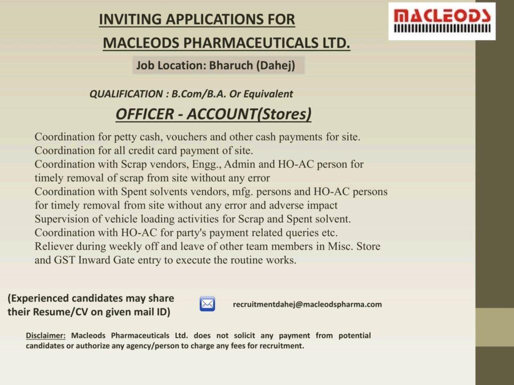 Macleods Pharmaceuticals Ltd. Inviting applications for OFFICER-ACCOUNT(Stores) ||Apply Now