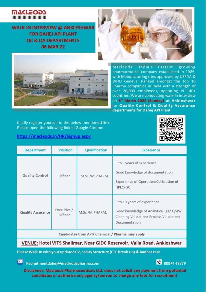 MACLEODS PHARMACEUTICALS LTD. Walk-In interview For Bharuch (Dahej) Location on 6th March 2022 For QA & QC Vacancies