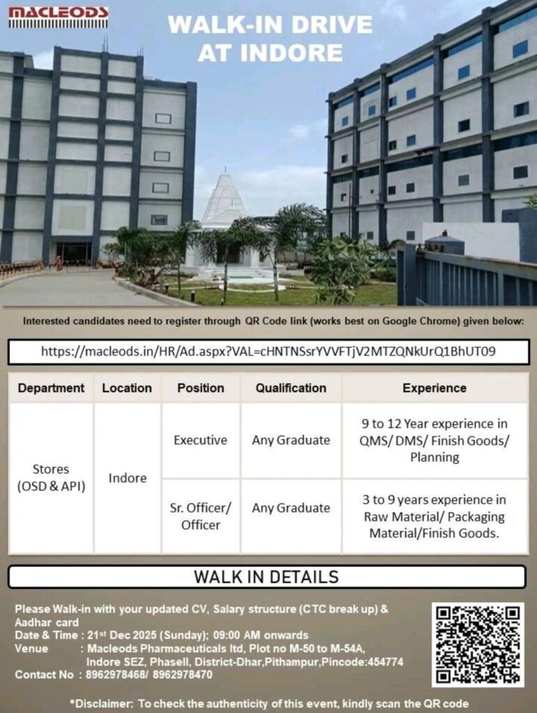 Macleods Pharmaceuticals Ltd is conducting a walk-in recruitment drive at its Indore facility. This is an excellent opportunity for experienced professionals in the pharmaceutical sector to join a globally recognized organization. The drive focuses on the Stores department, covering both OSD and API operations.