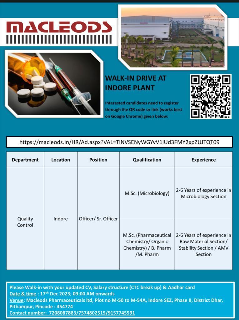 Macleods Pharmaceuticals Walk in Drive at Indore on 17th Dec 2023