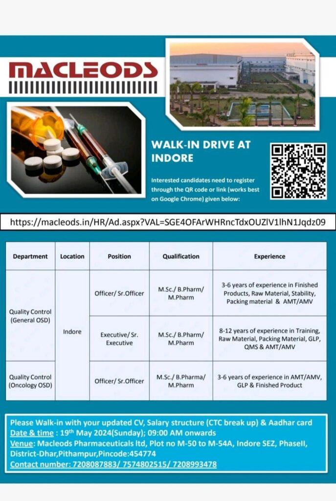 Macleods Pharmaceuticals Walkin drive at Indore Unit for QC department on 19/05/24, Sunday