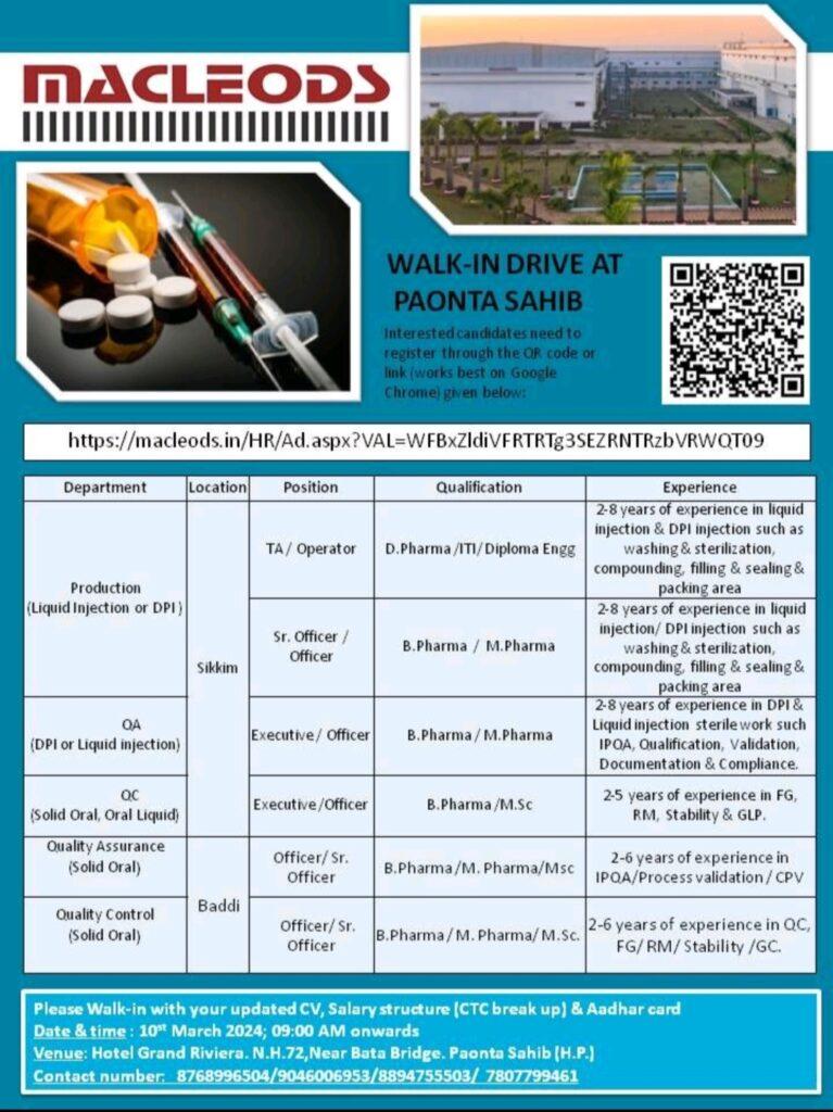 MACLEODS Walk in drive for QA, QC & Production on 10th March 2024