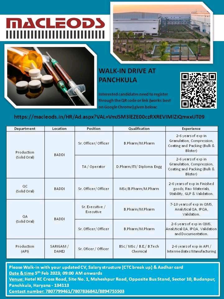 MACLEODS – Walk In Interview for Production (Solid Oral), QC, QA & Production (API) at Panchkula on 5th Feb 2023