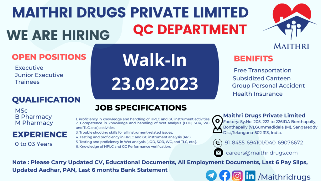 Maithri Drugs Private Limited, Bonthapally : QC (Method Validation) Department walk-in drive on 23-09-2023 | Fresher’s/ Junior Executive’s / Executive’s