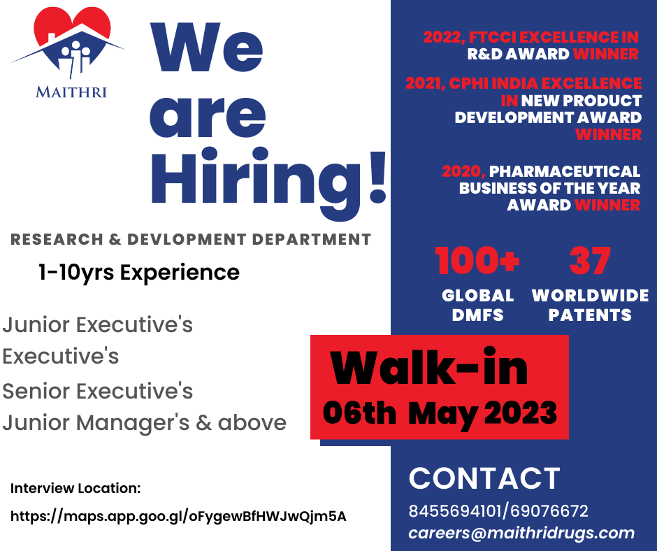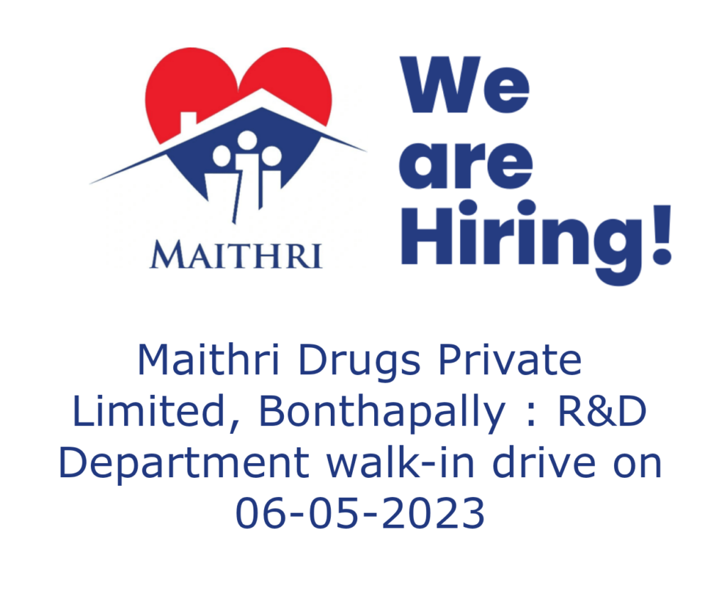 Maithri Drugs Private Limited, Bonthapally : R&D Department walk-in drive on 06-05-2023