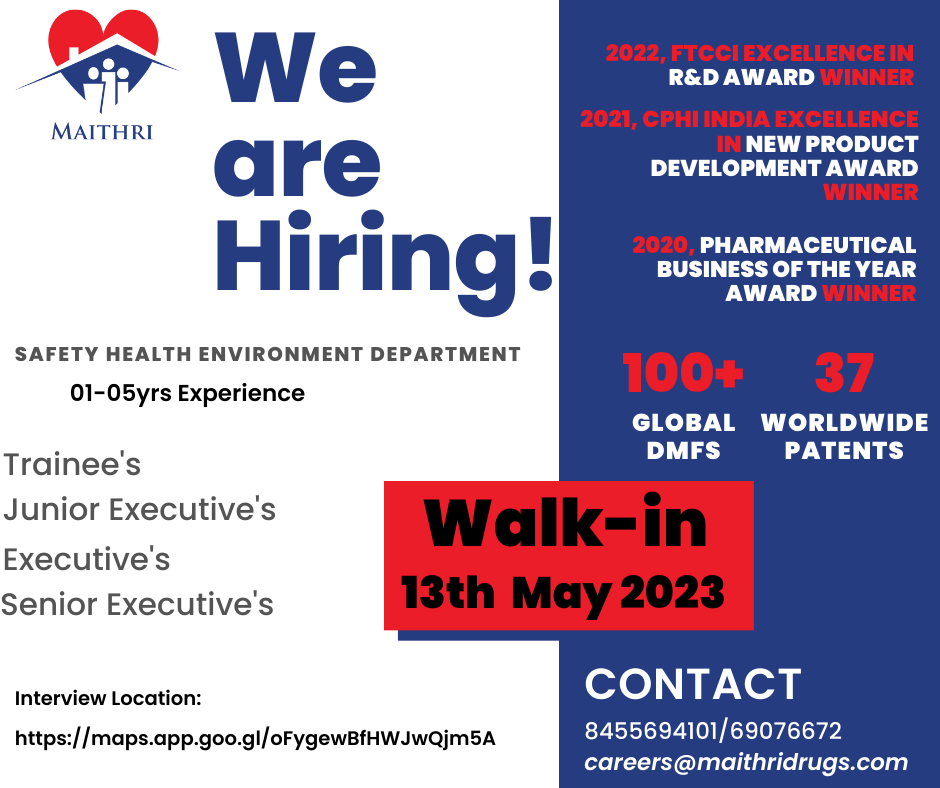 Maithri Drugs Private Limited, Bonthapally: Safety Health Environment Department walk-in drive on 13-05-2023.