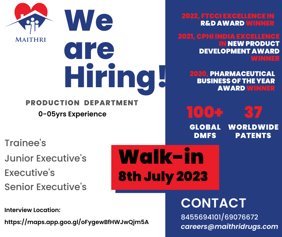 Maithri Drugs Private Limited, Bonthapally Walk-in Drive for Trainee’s (Fresher’s)/ Officer’s/ Junior Executive’s/ Executive’s – Production Department on 08/07/2023