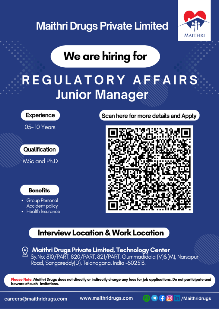 We are Hiring for Junior Manager Position in Regulatory Affairs Department in Maithri Drugs Private Limited