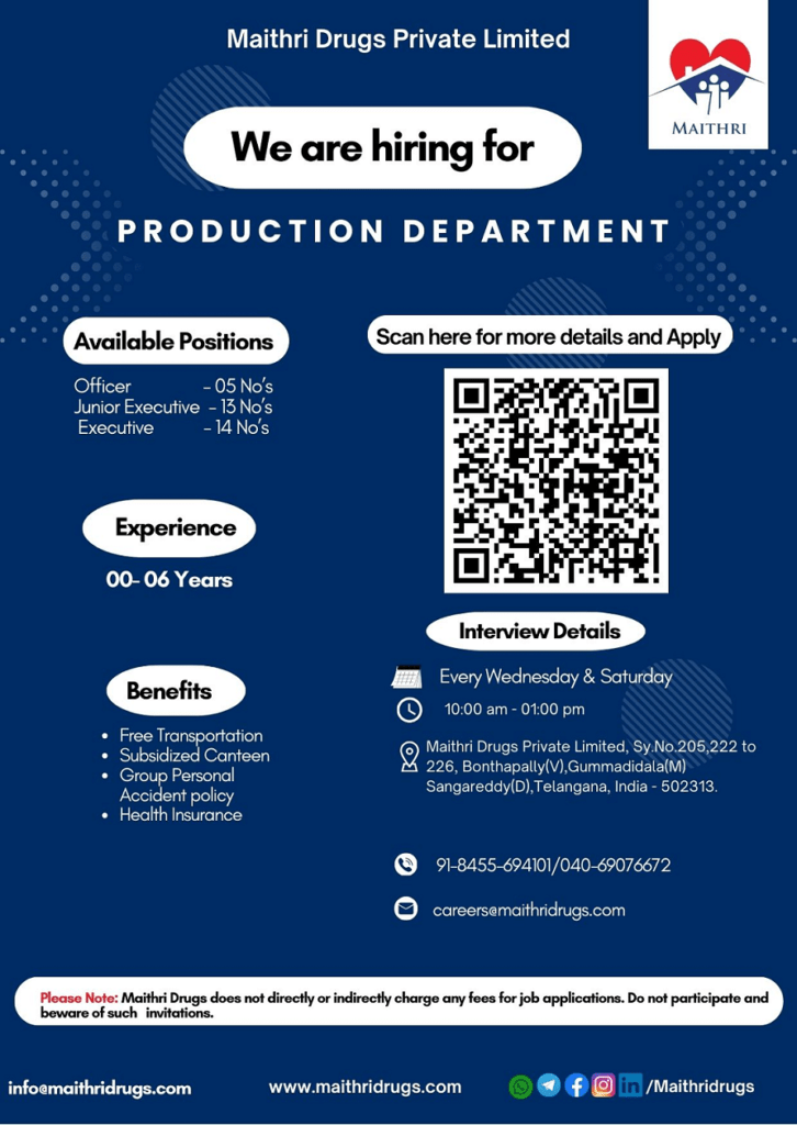 We are Hiring for the Production Department in Maithri Drugs Private Limited