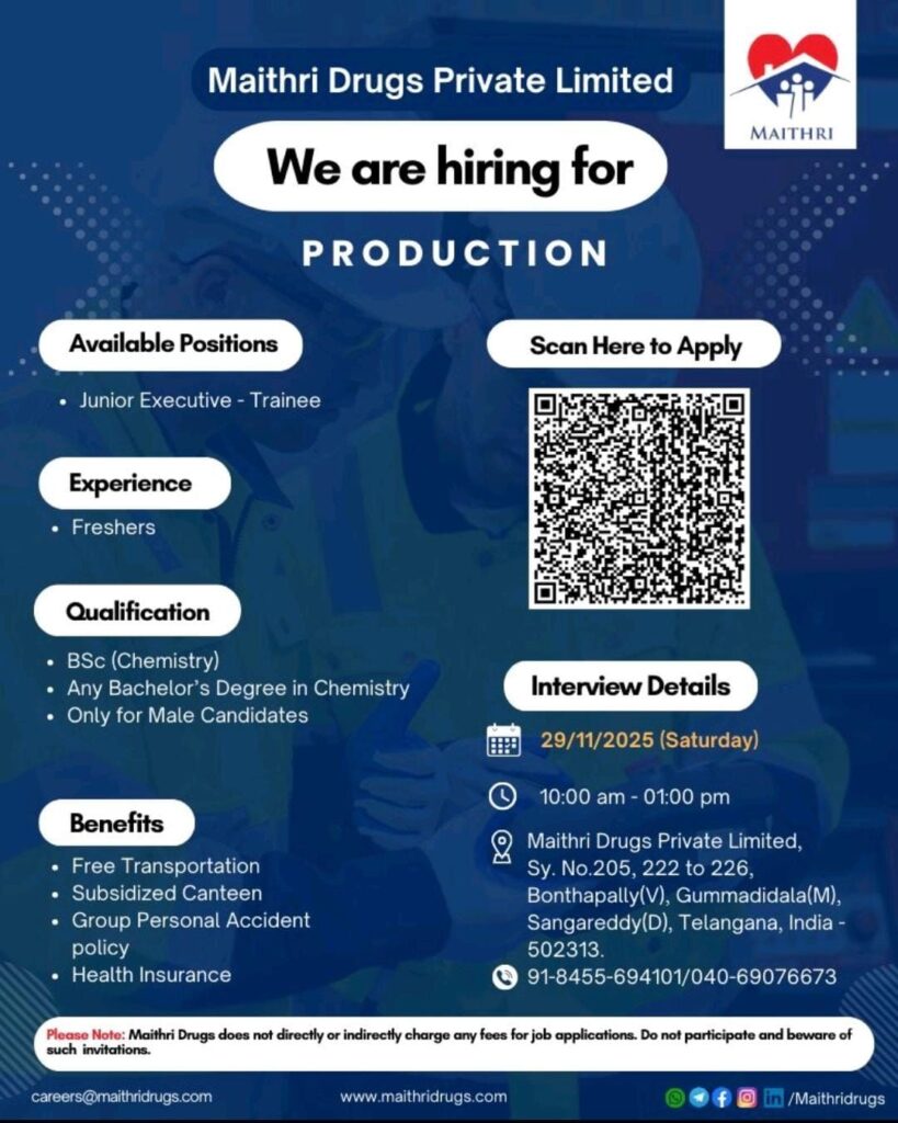 Maithri Drugs Private Limited, a well-known name in the pharmaceutical manufacturing sector, has officially announced a walk-in interview for Junior Executive – Trainee positions in the Production Department. This opportunity is ideal for fresh graduates in Chemistry who are looking to begin their career in the pharma industry.