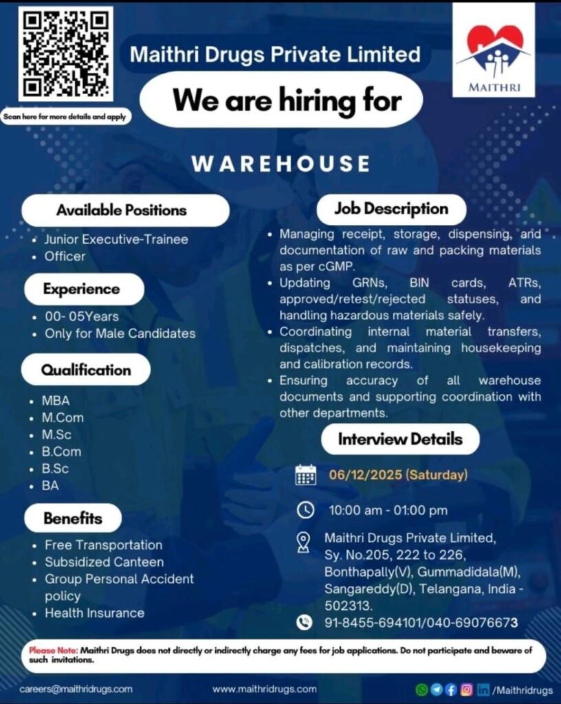 Maithri Drugs Private Limited, a reputed name in the pharmaceutical sector, has announced a recruitment drive for its Warehouse Department. The company is inviting qualified and enthusiastic male candidates to attend a walk-in interview for the positions of Junior Executive–Trainee and Officer. This opportunity is ideal for freshers as well as candidates with up to five years of experience who are looking to build a strong career in warehouse operations within a regulated pharma environment.