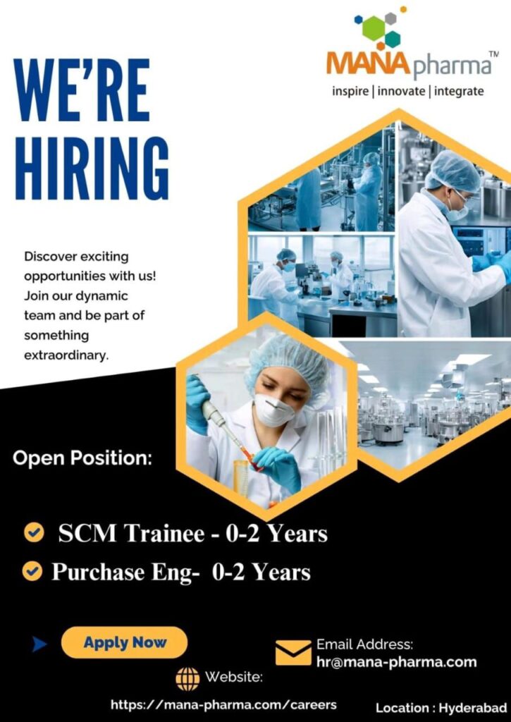 MANA Pharma, a leading name in pharma manufacturing, is inviting applications for fresh and dynamic candidates to join their growing team in Hyderabad.