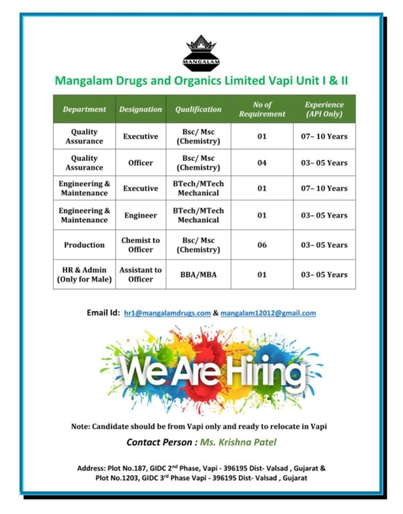 Email Id: hr@mangalamdrugs.com & mangalam12012@gmail.com