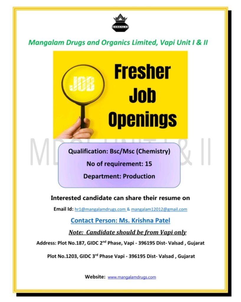 Fresher Job Openings @ Mangalam Drugs and Organics Limited, Vapi Unit I & II