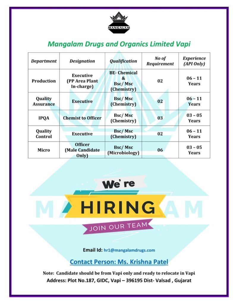 Mangalam Drugs and Organics Limited Vapi hiring for Production, Quality Assurance, IPQA, Quality Control, Micro department