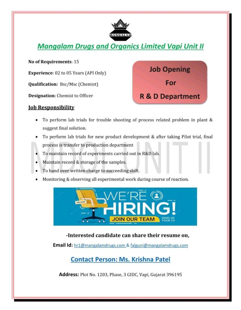 Mangalam Drugs and Organics Limited, Vapi Job Opening For R & D Department