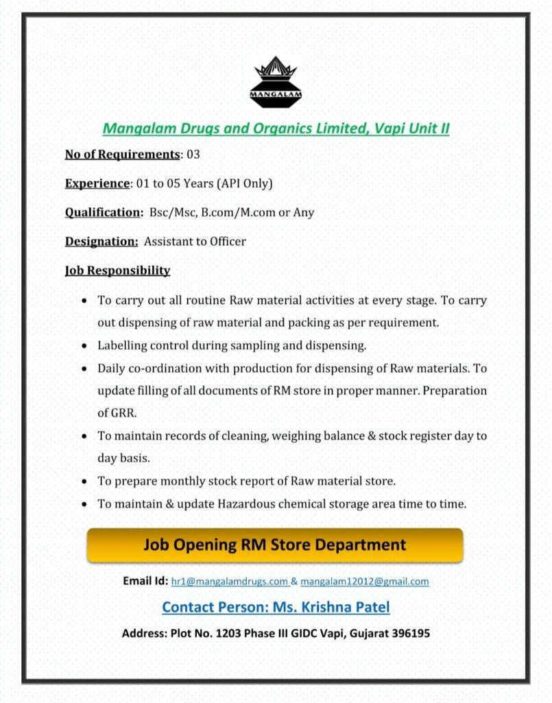 Mangalam Drugs and Organics Limited, Vapi Job Opening RM Store Department