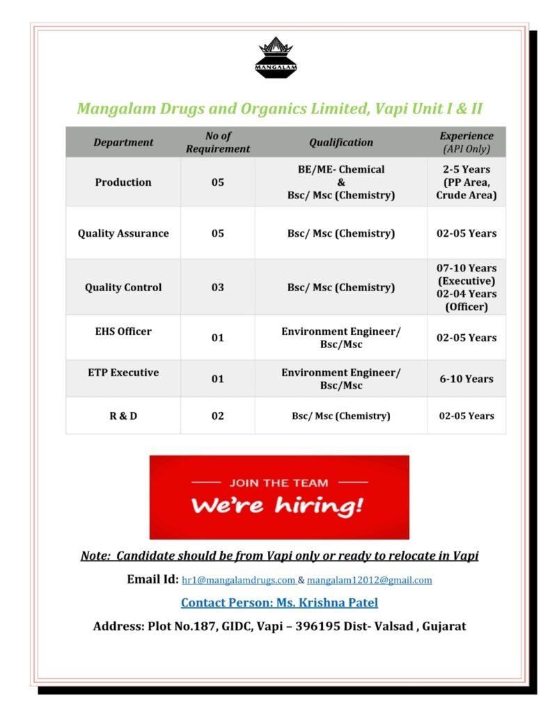 Mangalam Drugs And Organics Limited, Vapi Unit I & II, hiring for Production/ R&D/ QA/ QC/ EHS & ETP Executive