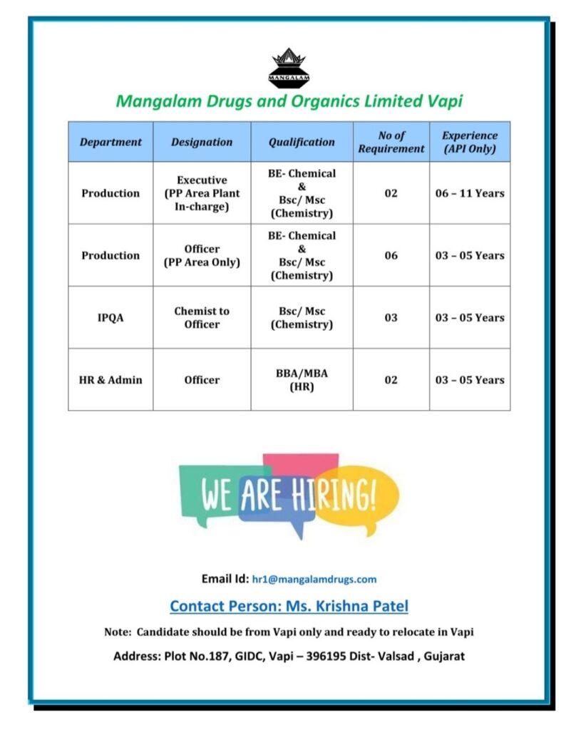 Mangalam Drugs & Organics Ltd Requirement for Production, IPQA, HR & Admin department