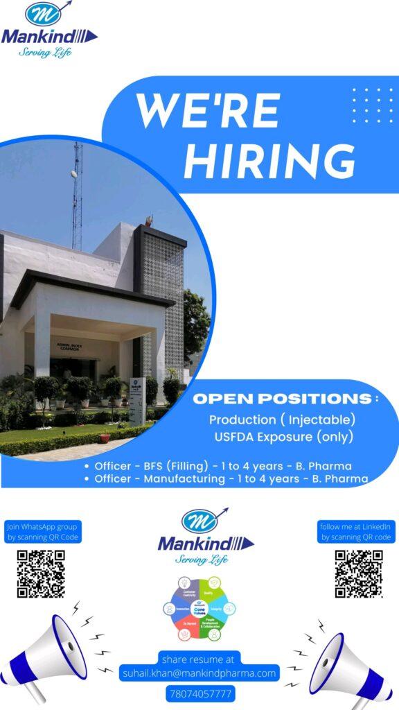Mankind Pharma hiring for Production (Injectable) department