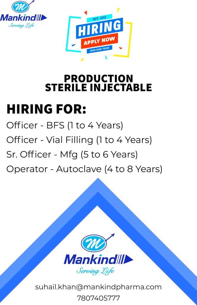 Mankind Pharma hiring for Production- Sterile Injectable department