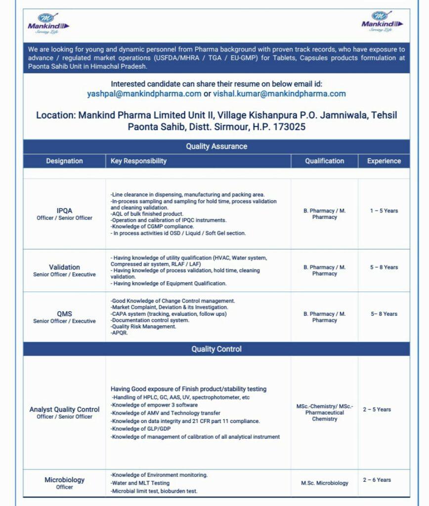 Mankind Pharma Multiple Openings for Quality Assurance & Quality Control department ||Apply Now