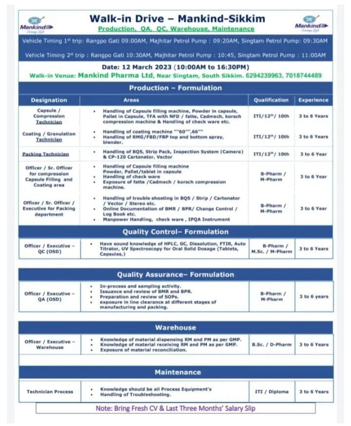 Walk-in Venue: Mankind Pharma Ltd, Near Singtam, South Sikkim. 6294239963, 7018744489