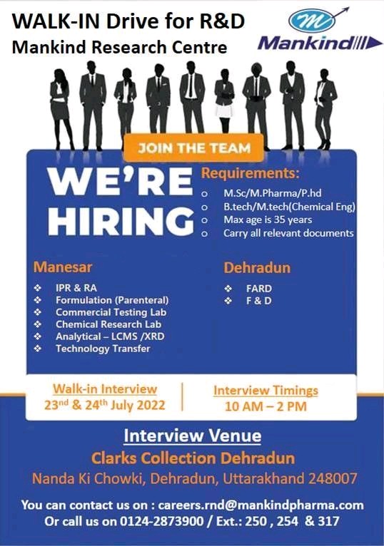 Mankind Pharma WALK-IN Drive for R&D on 23rd & 24th July 2022