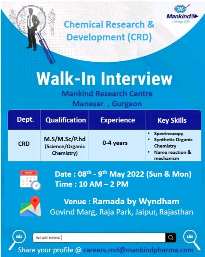 Mankind Pharma Walk-In Interview for freshers & experience in Chemical Research & Development (CRD) on 08th – 9th May 2022