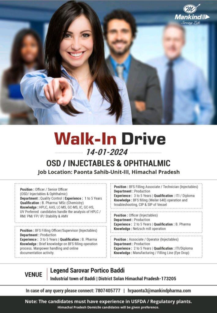 Mankind Pharma walk in interview on 14th Jan, 2024 (Sunday) for injectable/ OSD & Ophthalmic plant