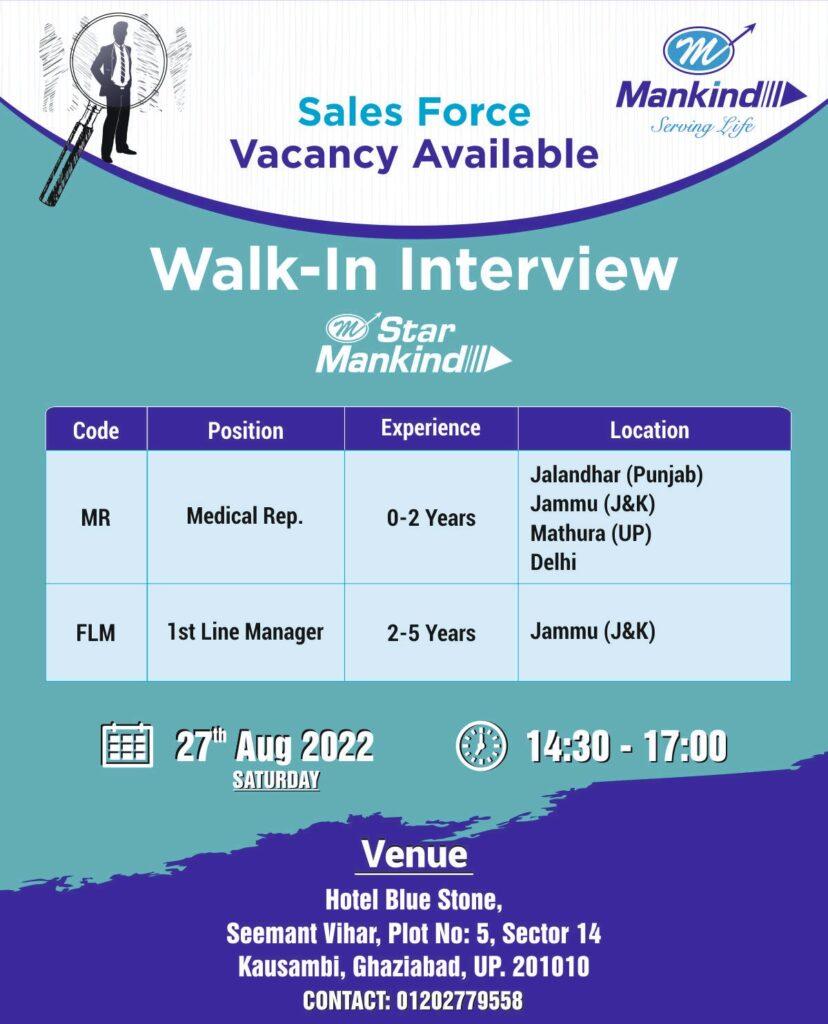 Mankind Walk-in drive for 1st Line Manager, Medical Rep. on 27th Aug 2022 at Ghaziabad, UP for Jalandhar (Punjab), Jammu (J&K)