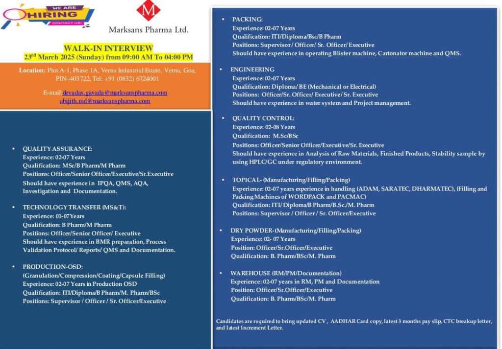 Qualification: IT/ Diploma/B Pharm/B.Sc./M. Pharm