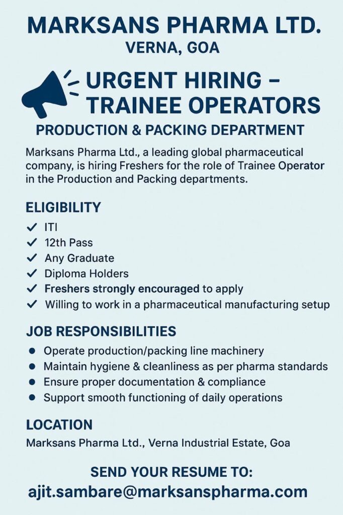 Marksans Pharma Ltd., a leading global pharmaceutical manufacturer, has announced an urgent recruitment drive for Trainee Operators in the Production and Packing departments at its Verna facility in Goa. This is an excellent opportunity for freshers and entry-level candidates looking to build a career in the pharma manufacturing sector.
