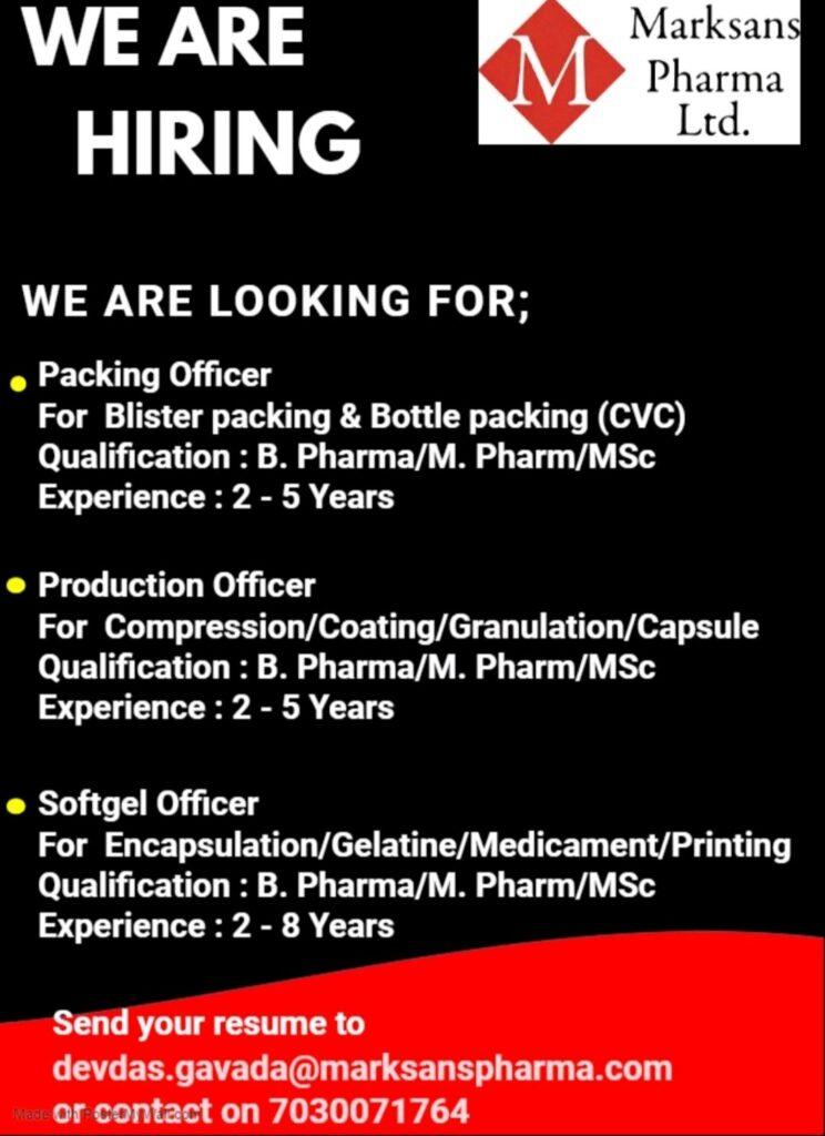 Marksans Pharma Ltd hiring for Production/ Packing & Softgel Officer