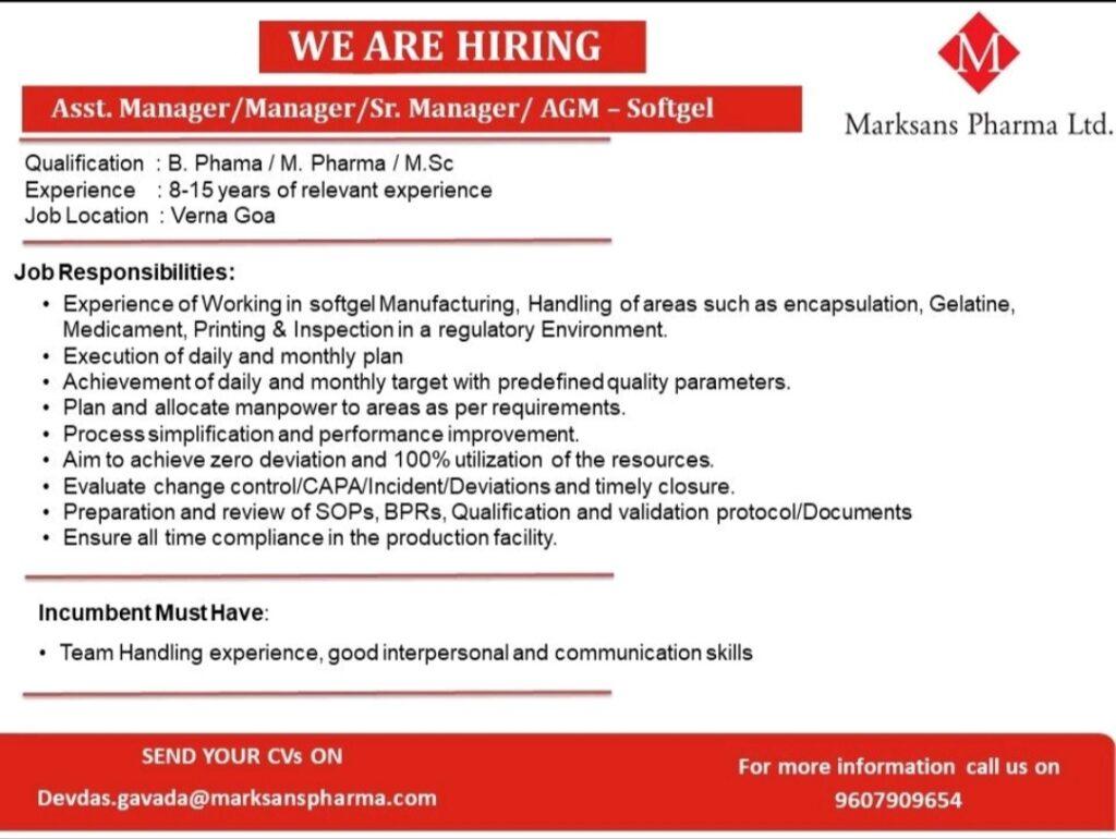 Marksans Pharma Ltd job vacancy for Asst. Manager/Manager/Sr. Manager/ AGM – Softgel