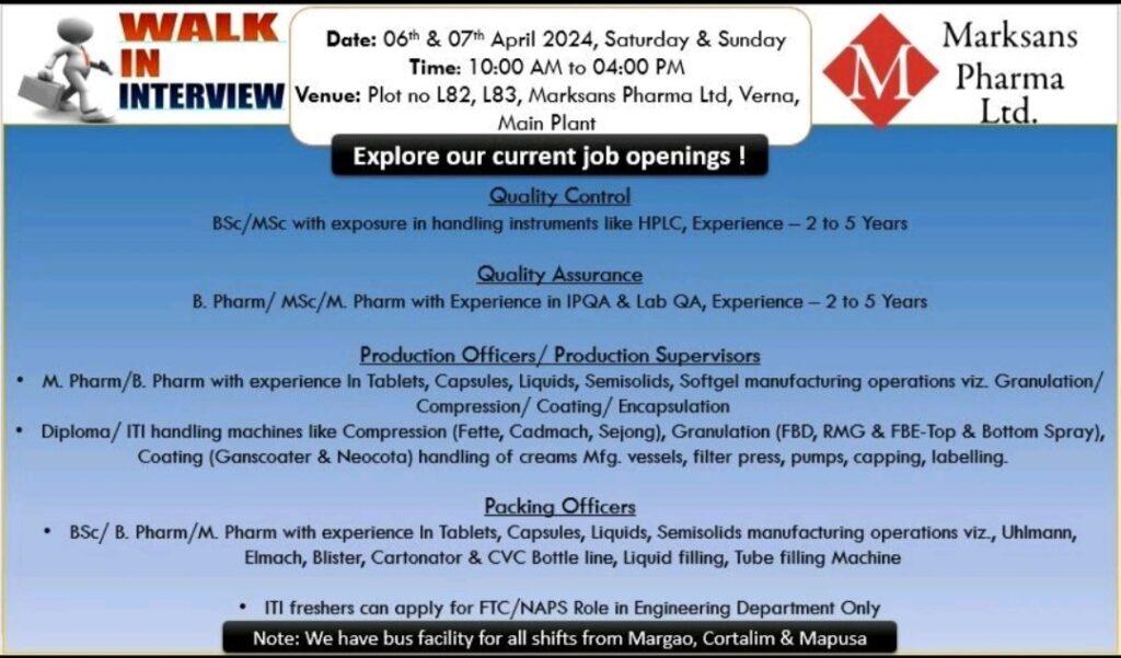 Marksans Pharma walk in interview for QA, QC, Production & Packing on 06th & 07th April 2024