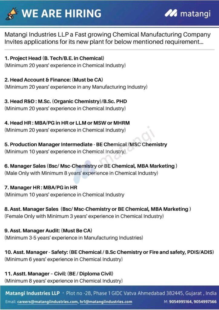 Matangi Industries LLP a Fast growing Chemical Manufacturing Company Invites applications for its new plant for below mentioned requirement…