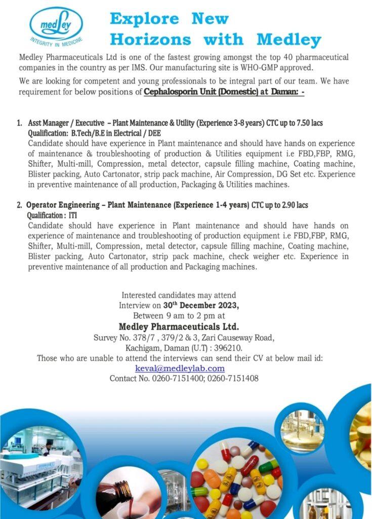 Walk-in drive on 30/12/2023 (Saturday) for Engineering Department at Medley Pharmaceuticals Ltd, at Cephalosporin Unit (Domestic) Daman (UT)