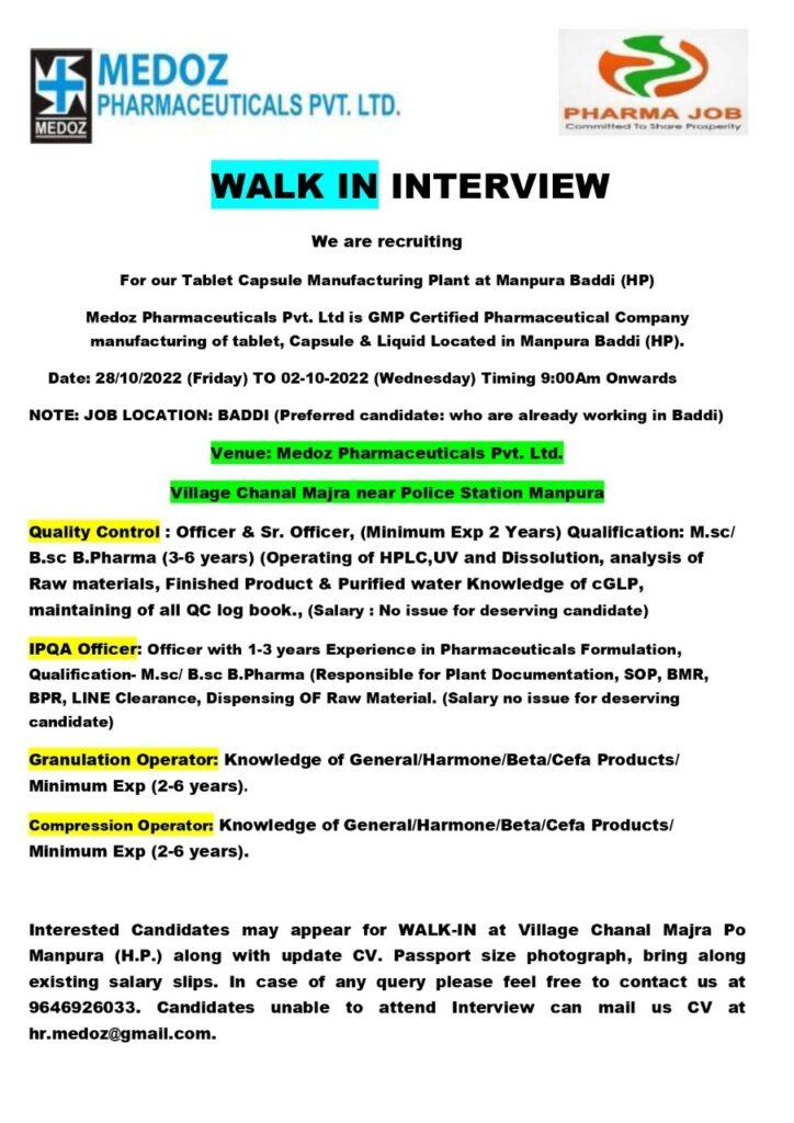 Interested Candidates may appear for WALK-IN at Village Chanal Majra Po Manpura (H.P.) along with update CV. Passport size photograph, bring along existing salary slips. In case of any query please feel free to contact us at 9646926033. Candidates unable to attend Interview can mail us CV at hr.medoz@gmail.com.