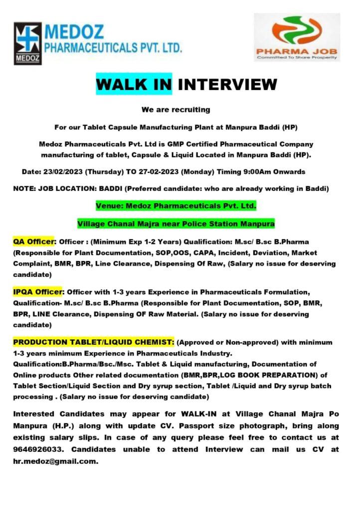 Interested Candidates may appear for WALK-IN at Village Chanal Majra Po Manpura (H.P.) along with update CV. Passport size photograph, bring along existing salary slips. In case of any query please feel free to contact us at 9646926033. Candidates unable to attend Interview can mail us CV at hr.medoz@gmail.com.