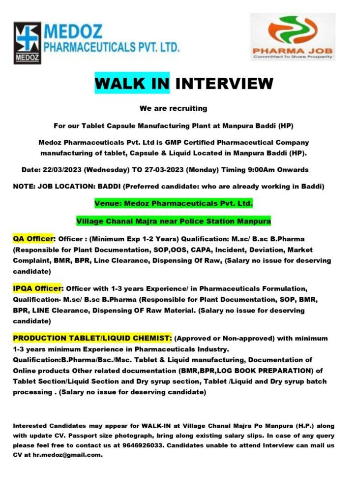 Medoz Pharmaceuticals- Walk In Interview for Tablet, Capsule Manufacturing Plant at Manpura Baddi (HP) on 22/ 03/ 2023 to 27/ 03/ 2023