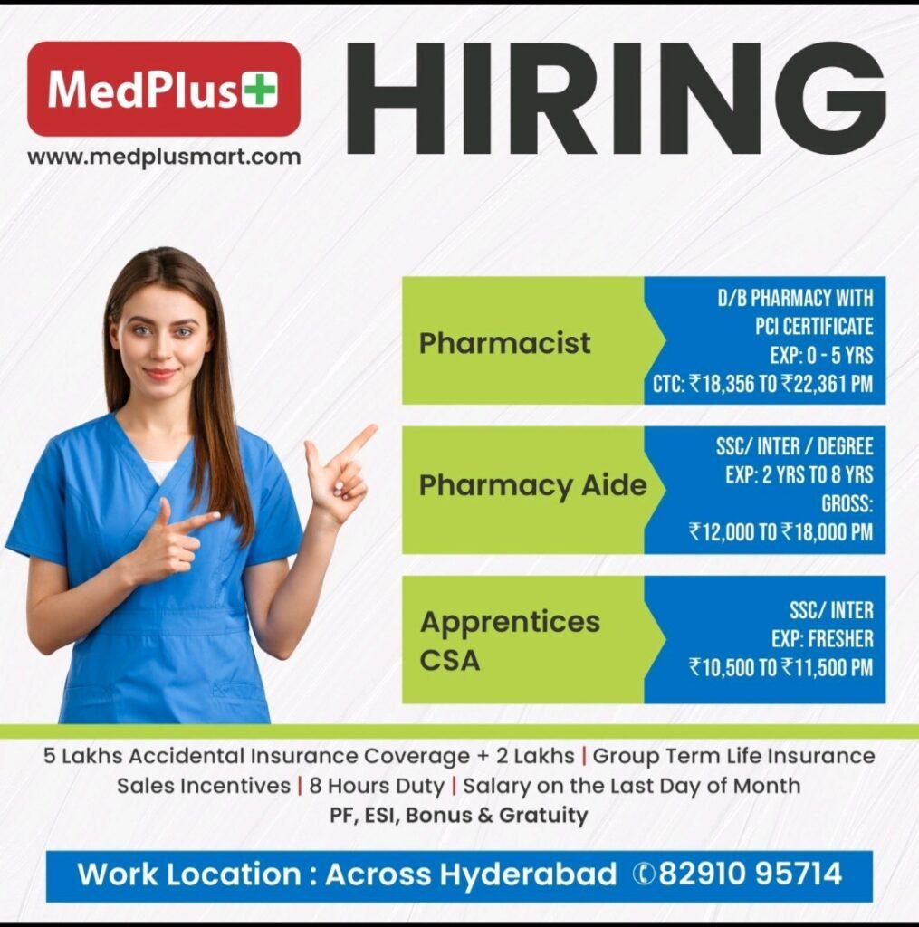 MedPlus hiring FRESHERS for Pharmacist, Pharmacy Aide & Apprentices CSA