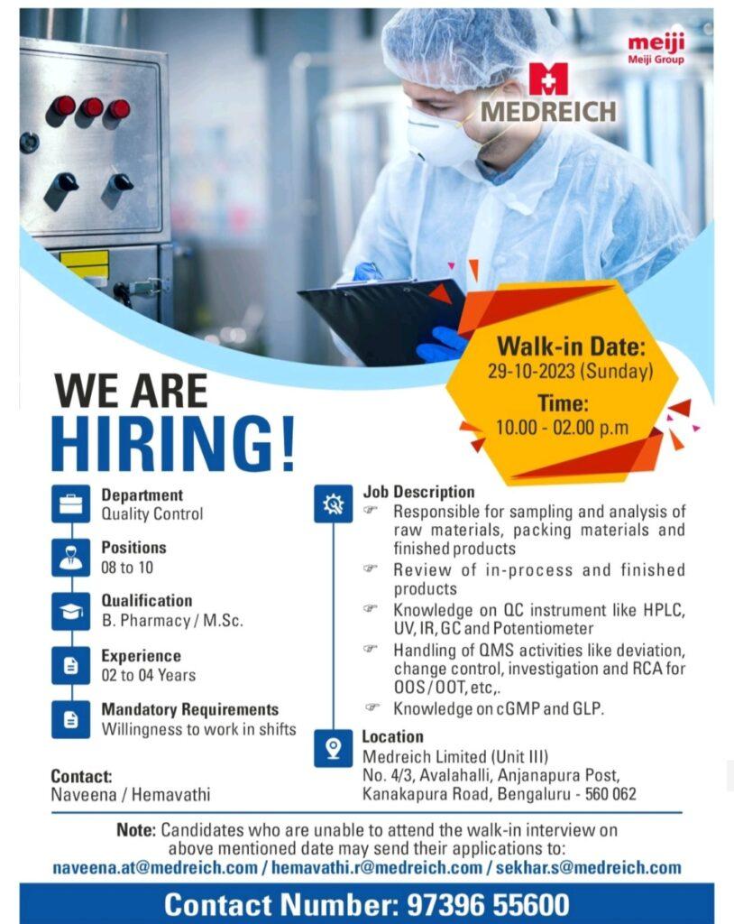 Note: Candidates who are unable to attend the walk-in interview on above mentioned date may send their applications to: naveena.at@medreich.com/ hemavathi.r@medreich.com/ sekhar.s@medreich.com