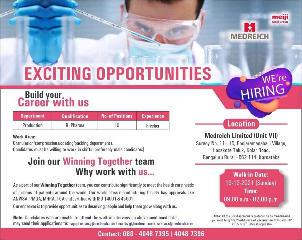 Medreich Limited, Walk In Interview for Freshers B.Pharm in Production Department on 19th Dec’21