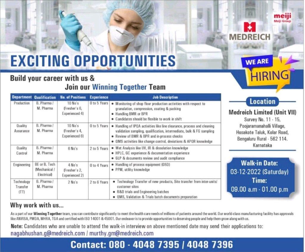 MEDREICH Walk In Interview for Freshers & experience in Production, Quality Assurance, Quality Control, Engineering, Technology Transfer (TT) department on 03-12-2022 (Saturday)