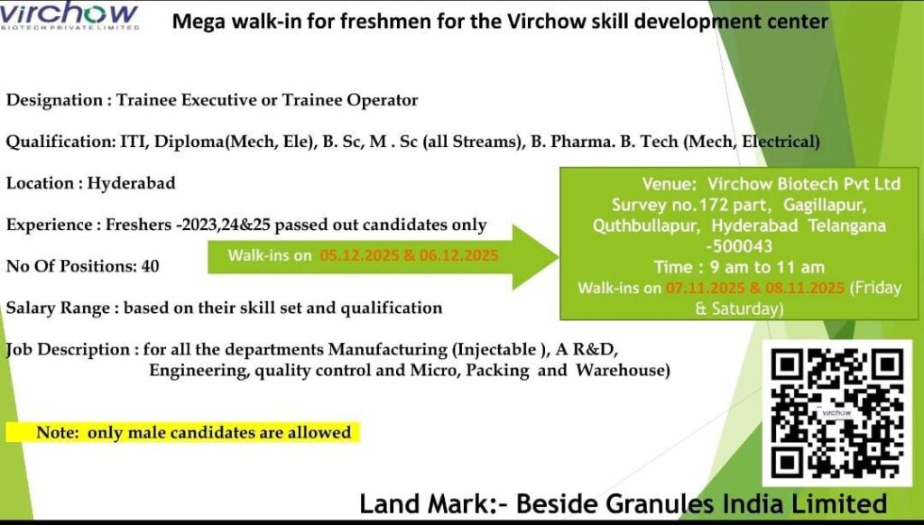 Virchow Biotech Pvt Ltd invites bright and enthusiastic freshers to a massive walk-in drive for various roles at their Skill Development Center in Hyderabad. This is a golden chance for 2023, 2024, and 2025 passed-out candidates to secure a position in a leading biotechnology company.