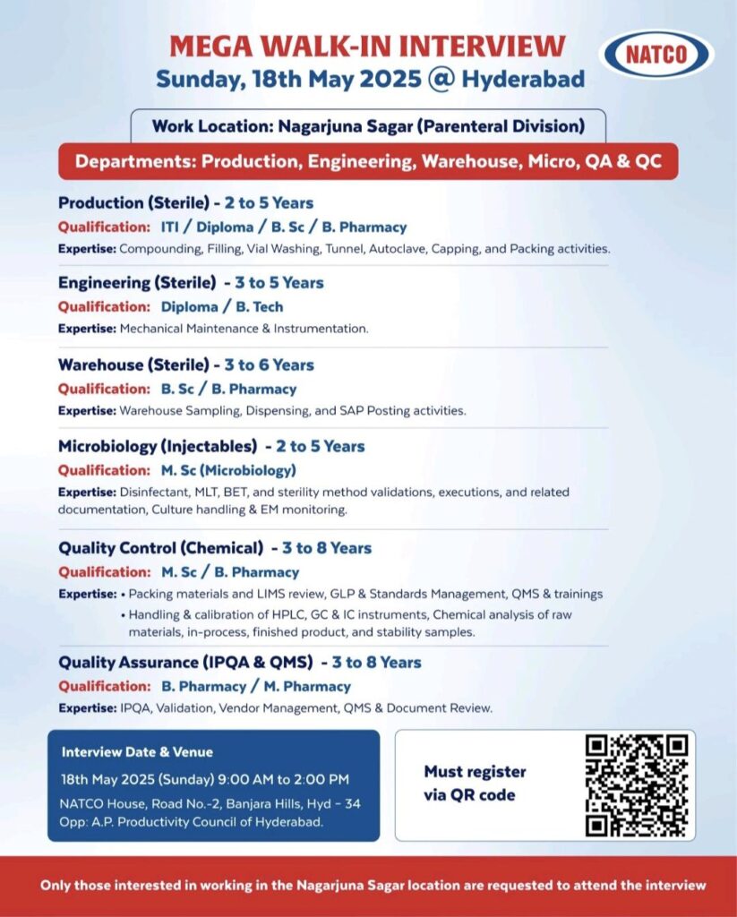NATCO Pharma is hosting a MEGA WALK-IN INTERVIEW on Sunday, 18th May 2025, in Hyderabad for multiple positions at its Nagarjuna Sagar (Parenteral Division) location. This is a golden opportunity for professionals in the pharmaceutical and engineering sectors to join a dynamic team and advance their careers.
