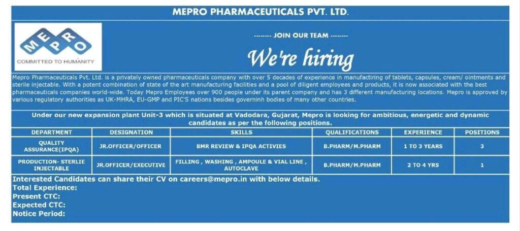 Mepro Pharma hiring for QA (IPQA)& Production (Injectable) department