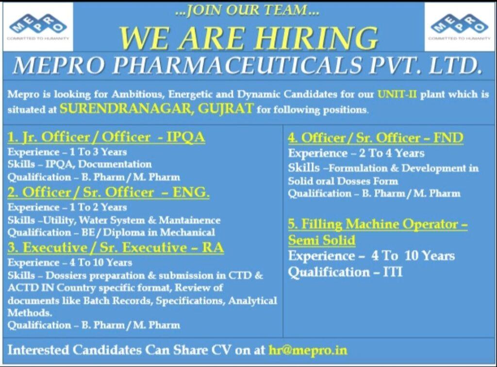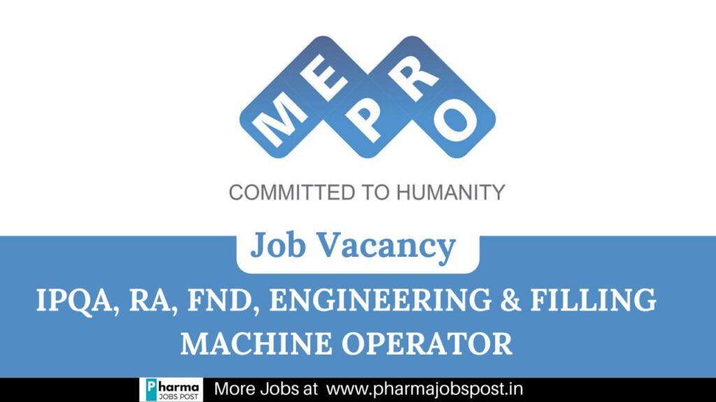 Mepro Pharmaceuticals hiring for IPQA, RA, FND, Engineering & Filling Machine Operator for UNIT-II plant