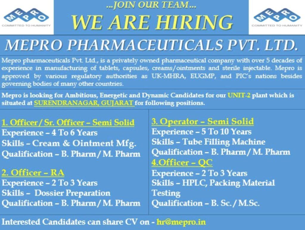 Mepro pharmaceuticals- hiring for Operator/ Officer/ Sr. Officer – Semi Solid, RA, QC – Apply Now